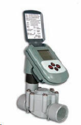 station battery operated controller. An ideal product for applications where valve(s) are isolated from an irrigation controller or a power source is difficult or cost prohibitive to access. Controller and solenoid are powered by one standard alkaline 9 Volt battery. Controller has a large easy to understand LCD display with most all the same programming options a standard controller would offer. Controller is designed to be mounted on top of a valve solenoid in a valve box subject to the moist, wet conditions typically found in an underground valve installation. Features • Real Time Programming with current time of day and real 7 day calendar • Valve Run Time in one minute increments from 1 minute to 11 hours and 59 minutes • Up to 3 Start Times per Day • Programmable Manual Operation • Sealed battery compartment • Compatible solenoid is provided with each Controller • Standard solenoid is compatible with most all valves except Rainbird™. Adapter for Rainbird™ valve applications is available part# SOL-AD-RB • Battery life is good for a minimum of one season assuming battery is fully charged upon installation • Weather Resistant and Waterproof to 3 feet • Battery Low Voltage Indicator on LCD Display • Maximum pressure rating is 120 psi