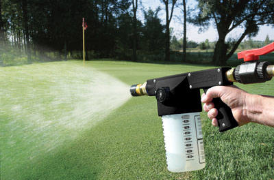 When customers requested a liquid version of the PelletPro™, the proven combination of our Precision™ Cloudburst™ nozzle and a high-flow composite / stainless steel valve had us half of the way there. We added a chemical-resistant, UV-protected, lightweight siphon / mixing system in between to produce an applicator gun which can cover 1000 square feet in less than a minute. Liquid wetting agents, fertilizers, micronutrients can now be virtually "painted on" to turf with unmatched speed and uniformity. And like the PelletPro™, the LiquidPro™ disassembles easily to create a Cloudburst™/ High-Flow Valve syringe nozzle.