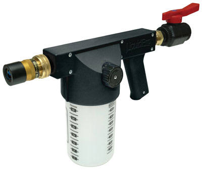 When customers requested a liquid version of the PelletPro™, the proven combination of our Precision™ Cloudburst™ nozzle and a high-flow composite / stainless steel valve had us half of the way there. We added a chemical-resistant, UV-protected, lightweight siphon / mixing system in between to produce an applicator gun which can cover 1000 square feet in less than a minute. Liquid wetting agents, fertilizers, micronutrients can now be virtually "painted on" to turf with unmatched speed and uniformity. And like the PelletPro™, the LiquidPro™ disassembles easily to create a Cloudburst™/ High-Flow Valve syringe nozzle.