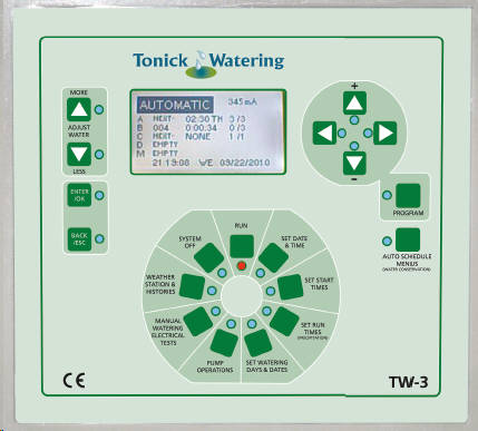 Following on from the best-selling Watermation TW-2 controller, the Tonick TW-3 combines simplicity of programming with the latest technology. This makes it extremely easy to set up, with a dial-type rotary switch and graphics backlit LCD. As with other latest high technology products, there is a significant reduction in both cost and size.